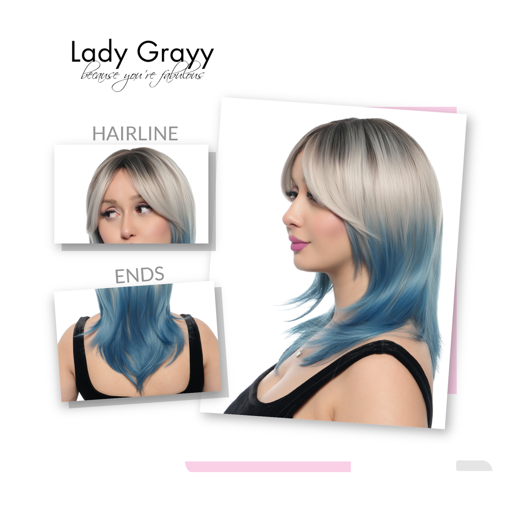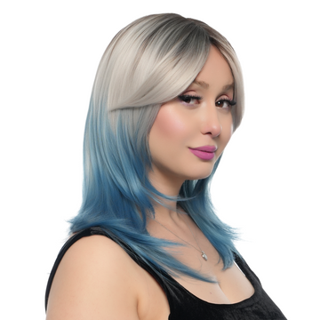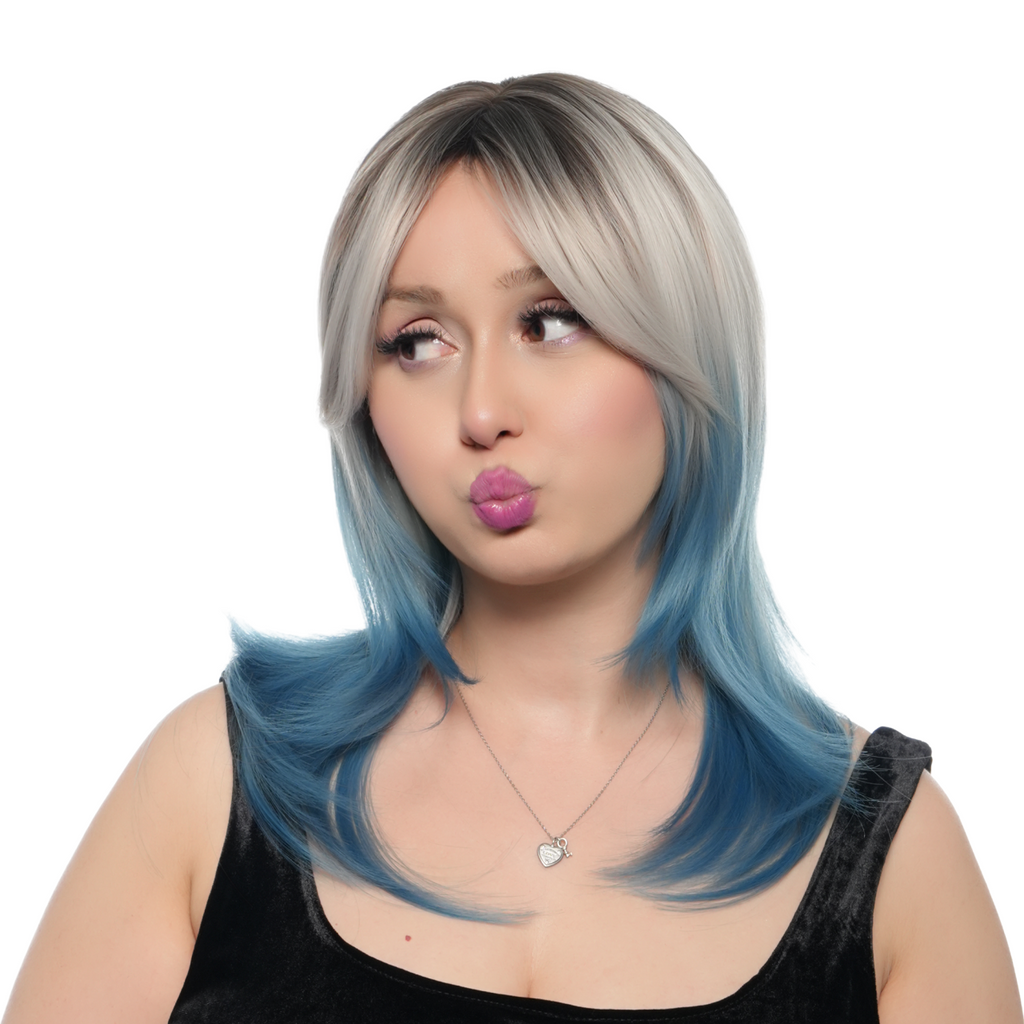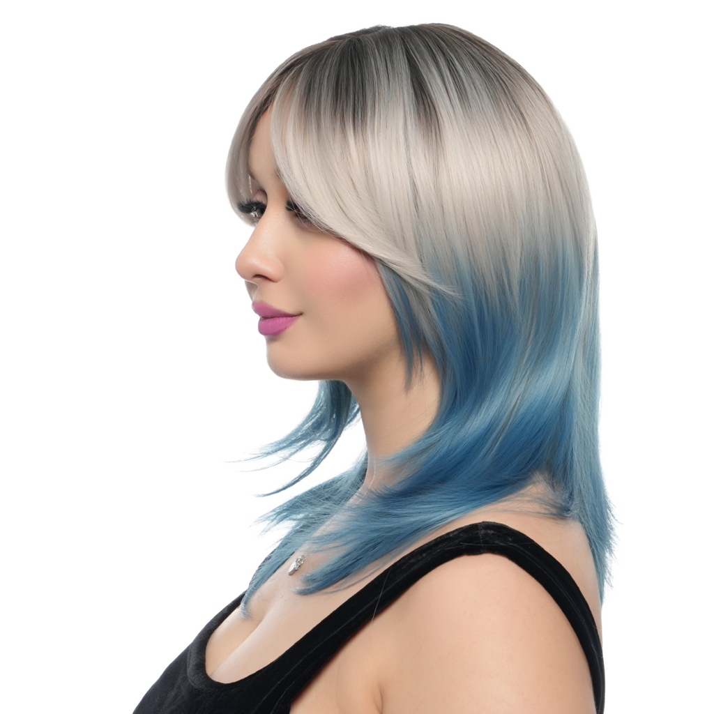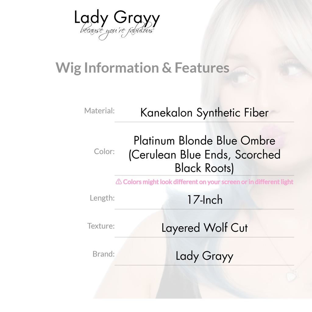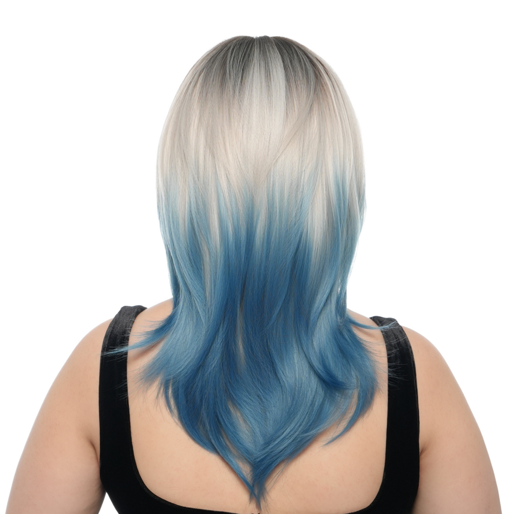 17-Inch Platinum Blonde Blue Ombre (Cerulean Blue Ends, Scorched Black Roots) Layered Wolf Cut Synthetic Wig