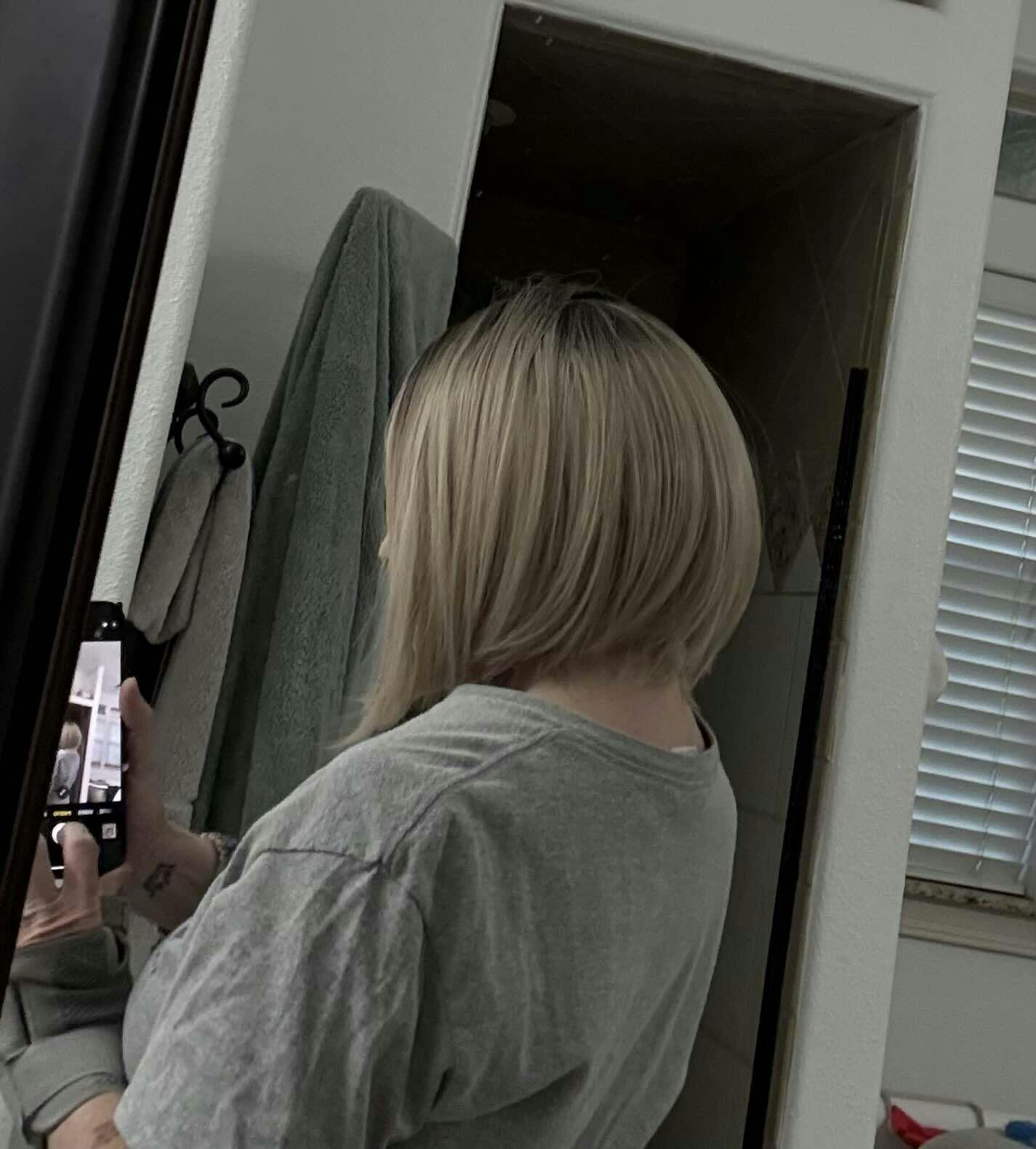 10-Inch Warm Platinum Blonde Blend Ōmbre (Black Roots) Straight Bob Synthetic Wig