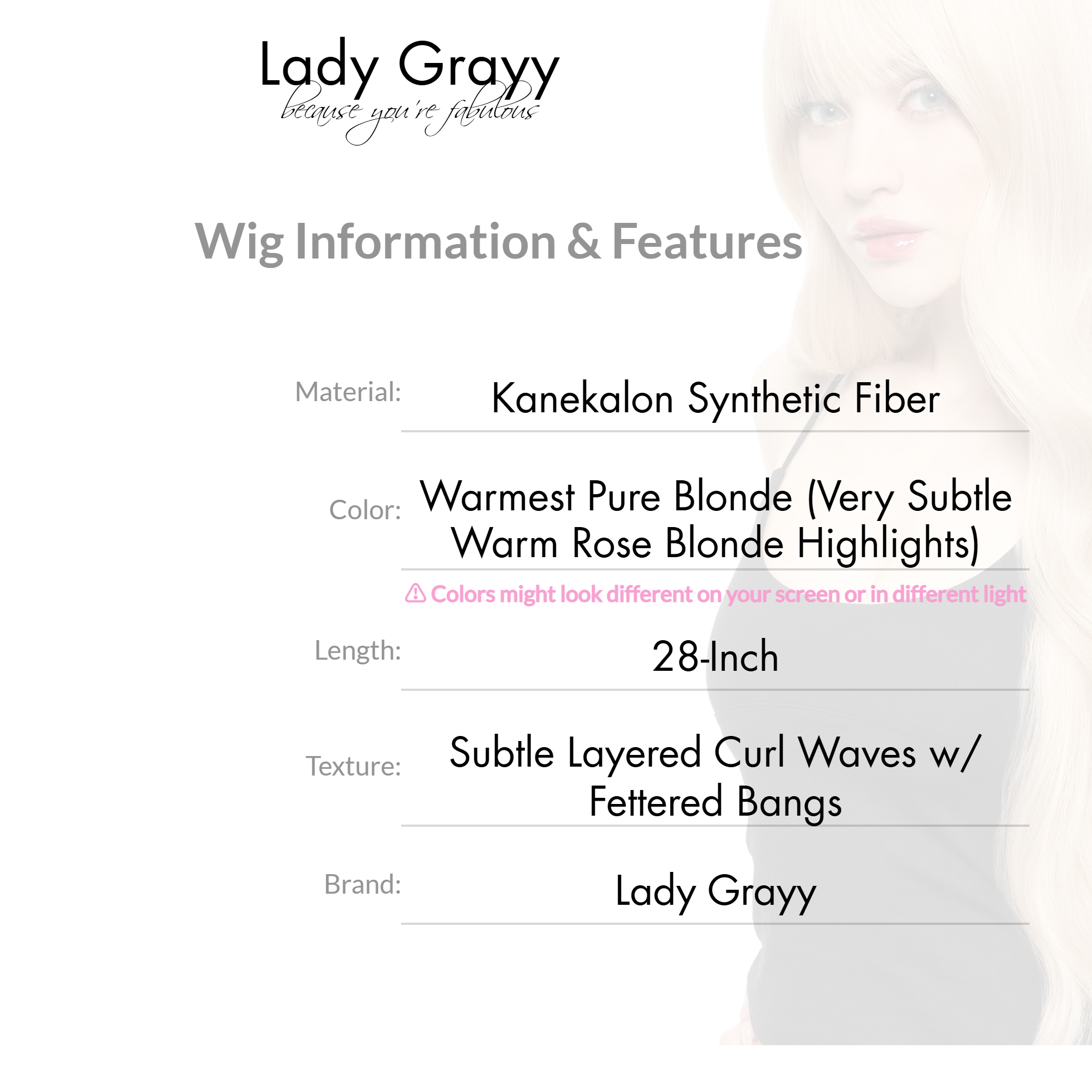 'BOMBSHELL' 28-Inch Warmest Pure Blonde (Very Subtle Warm Rose Blonde Highlights) Subtle Layered Curl Waves w/ Fettered Bangs Synthetic Wig