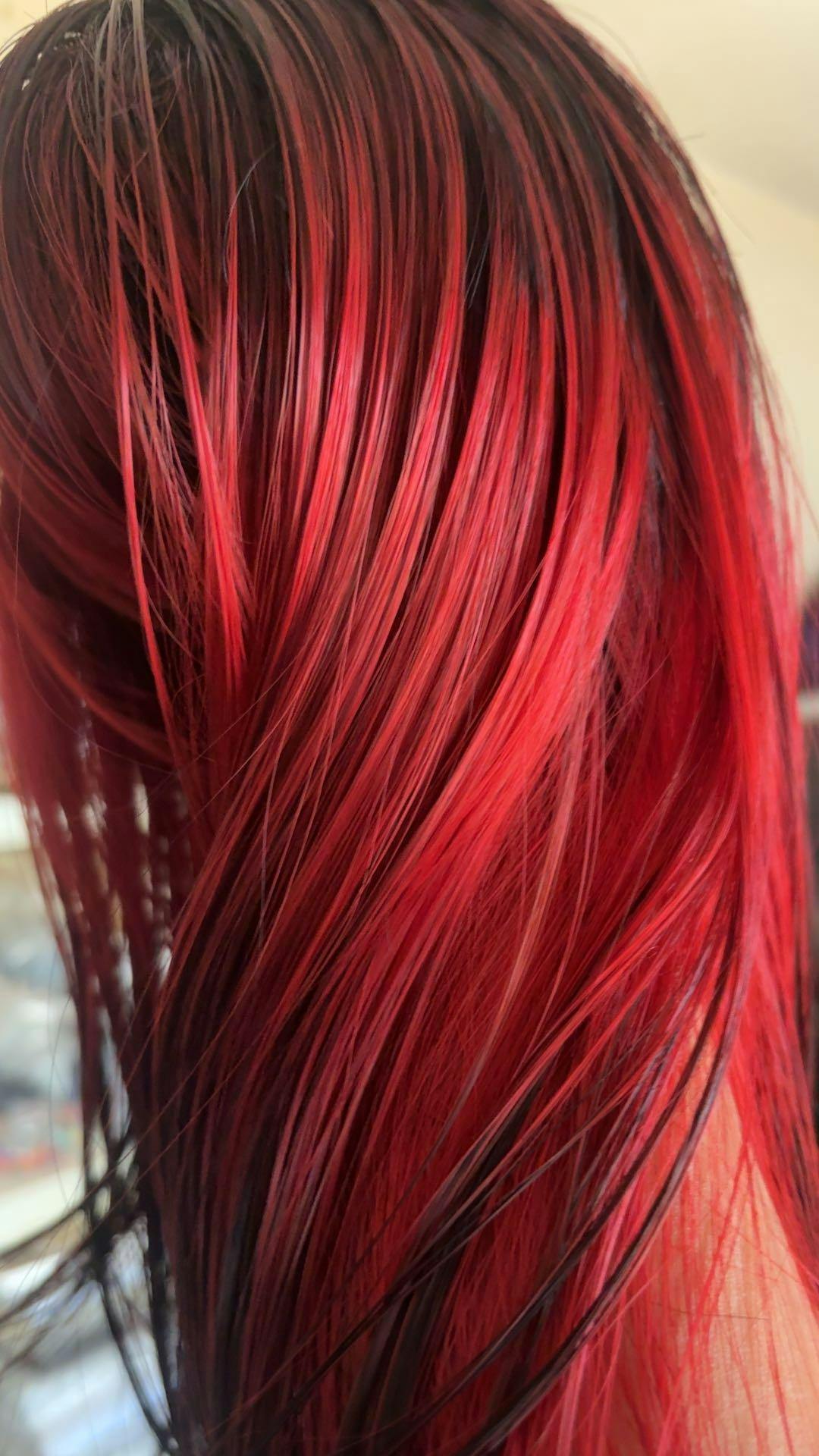 - Color: Vibrant Red Reverse Ombre (Black Roots)
